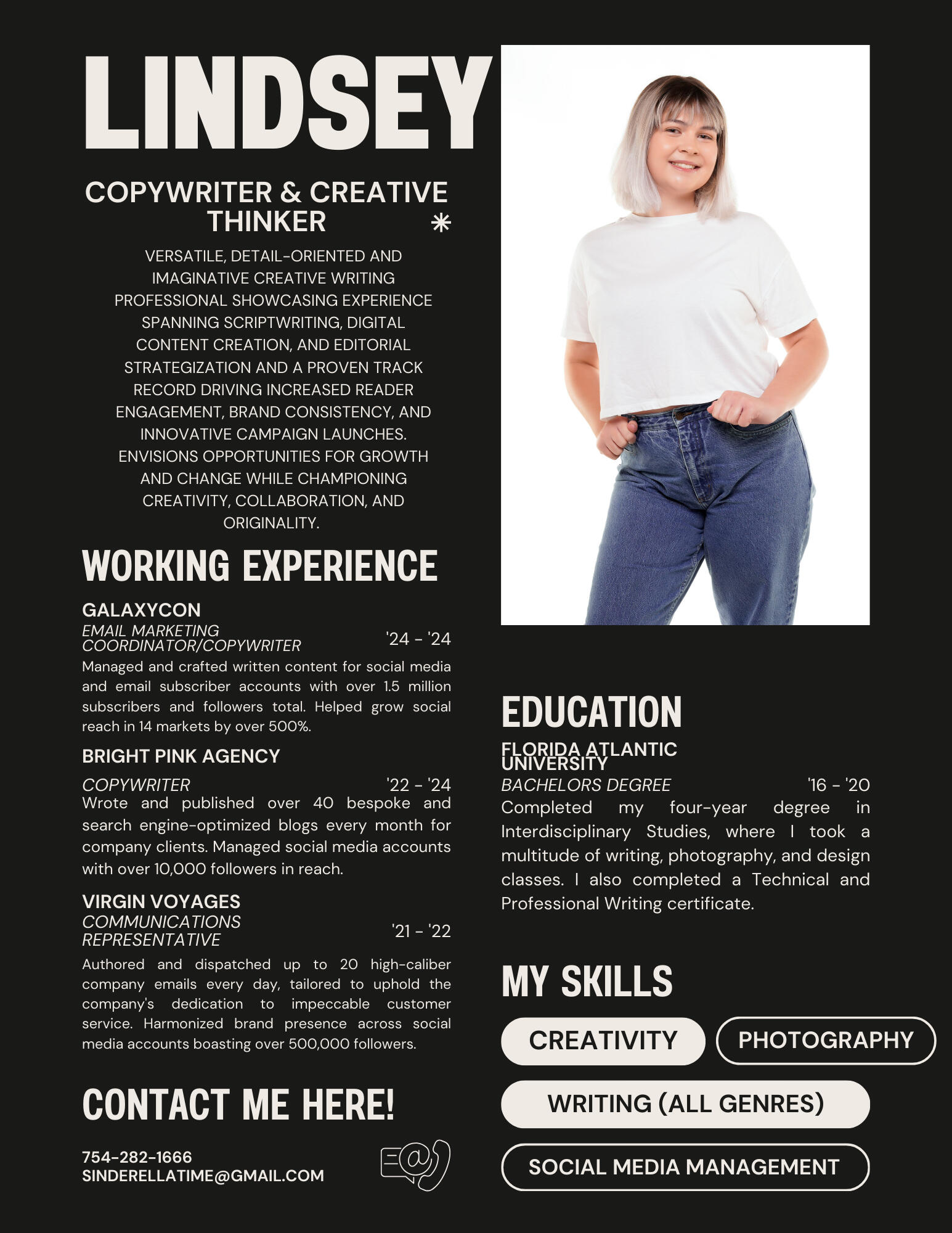 Dear suspecting site visitor,Hello! My name is Lindsey, but you might know me as Sinderella if you've caught me on Twitch, or have spoken to me on Discord or Twitter (I'm not calling it X; sorry Elon).I've always known that I had trouble focusing on a single activity for a long period of time. I would get really interested, delve deep into it, and soon find myself bored. The cycle would repeat every time I found myself interested in a new thing. I thought something was wrong with me, and that I'd never be able to amount to anything specialized. However, after being shown a very insightful TedTalk done by Emilie Wapnick, I learned that I'm what is called a "Multipotentialite," somebody who has many interests and creative pursuits. I have learned to embrace this title, and have thus started to embrace my many interests.With experience ranging from being totally self-taught, to working for significant brands like GalaxyCon, Central Bark, PuroClean, and Hustle Butter, to being mentored by experienced narrative designer and game writer Greg Buchanan, I can say that I am the well-rounded professional you might be looking for for your next creative project.Need some slick marketing copy? I got you.Need a blog or four for your brand website? I got you.Need some awesome lore for your new video game or Dungeons and Dragons campaign? I got you.Looking for someone to help you with the words for your fiction epic? I got you.Want some art of character that has been banging around in your head for a while? Guess what? I still got you!My background, skillset, and willingness to try new things and challenge myself makes me the perfect candidate for filling in your art or writing-based needs. Wherever you have any cracks in your project or workload, you’re welcome to use my expertise to spackle it right up (if I made you cringe with that analogy, you’re so welcome).Well, you read this far, so what are you waiting for? Shoot me a message and let’s make something cool together!Stay tuned,
